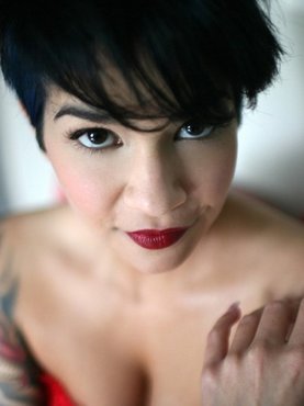 Страстная девушка неформальной внешности снимает черное платье в своей комнате и демонстрирует татуировки на спине. Красотка ложится на ковер и принимает горячие позиции, проводя по аппетитному телу руками. На короткое время голая барышня выходит на балкон, а потом помещается на диван и продолжает сексуальные шалости там.