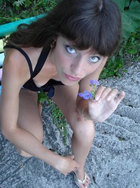 Эта девушка явно застряла в 1970-х годах в эпохе хиппи. Она очень любит тату, и Пинк Флойд, но совсем не дружит с бритвой. Между аппетитных бедер у девицы возникли настоящие шелковистые заросли. Но этот пушок отлично дополняет стройную фигуру неформалки, татушка хорошо смотрится на упругом животе, а еле вмещающиеся в белый бюстгальтер пышные груди просто великолепны.
